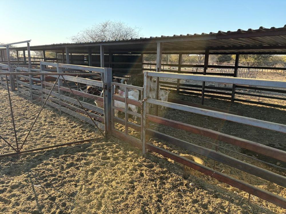 The farm includes permanent improvements such as a main house, double garage with a carport, a storage shed, a meat-processing room with a basement cooler, staff housing with ablution facilities, and a small cheese factory.