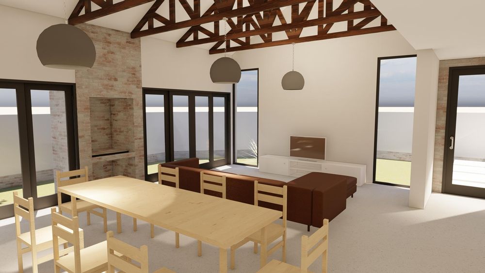 This freestanding cottage-style house features open-plan living with indoor BBQ, natural light from exposed roof trusses, and a kitchen with built-in cupboards, stove, oven, scullery, and pantry.