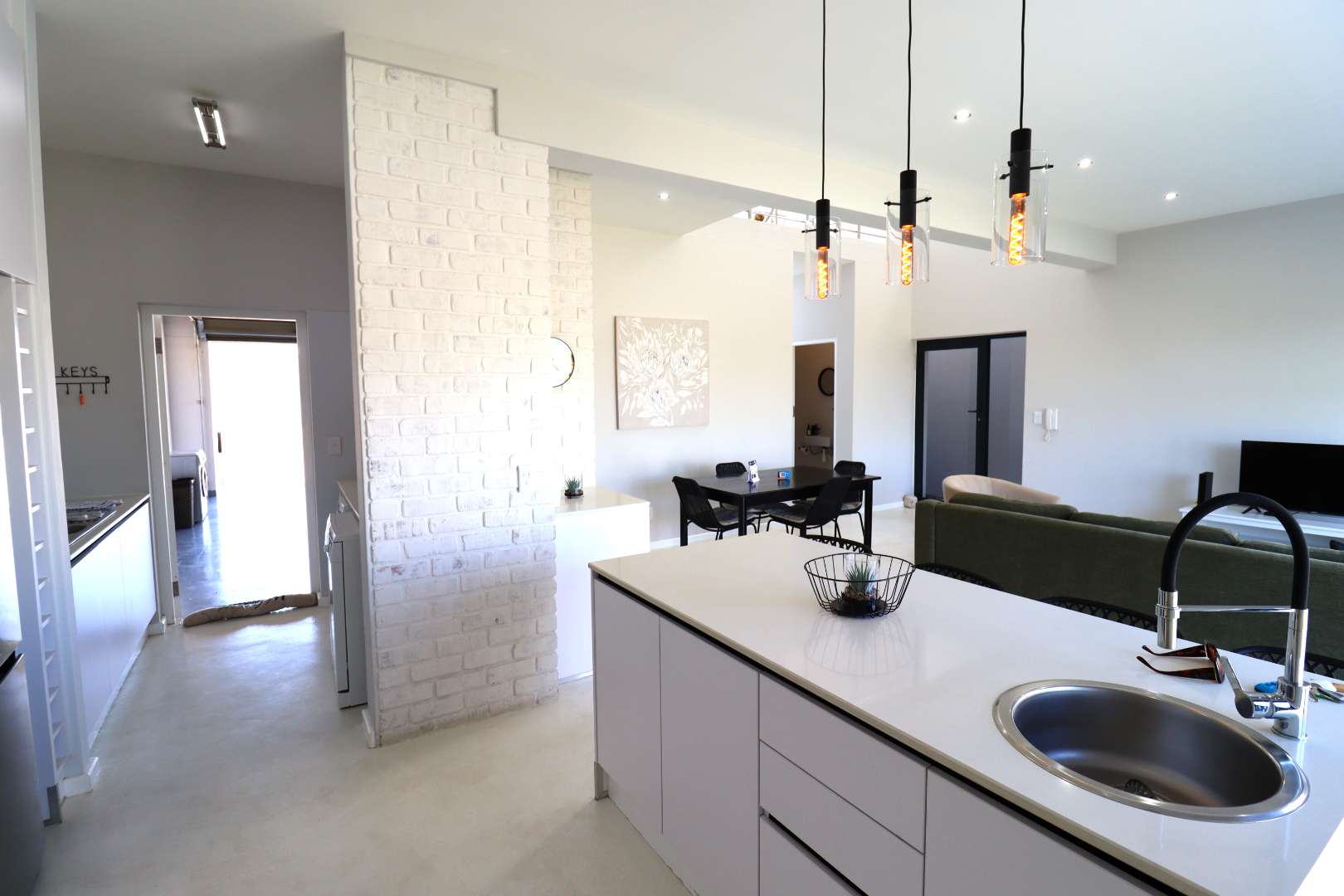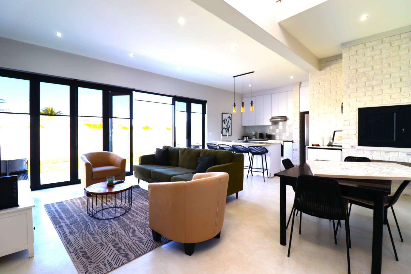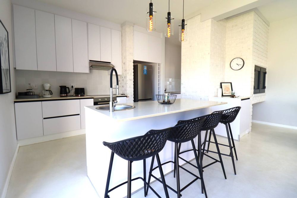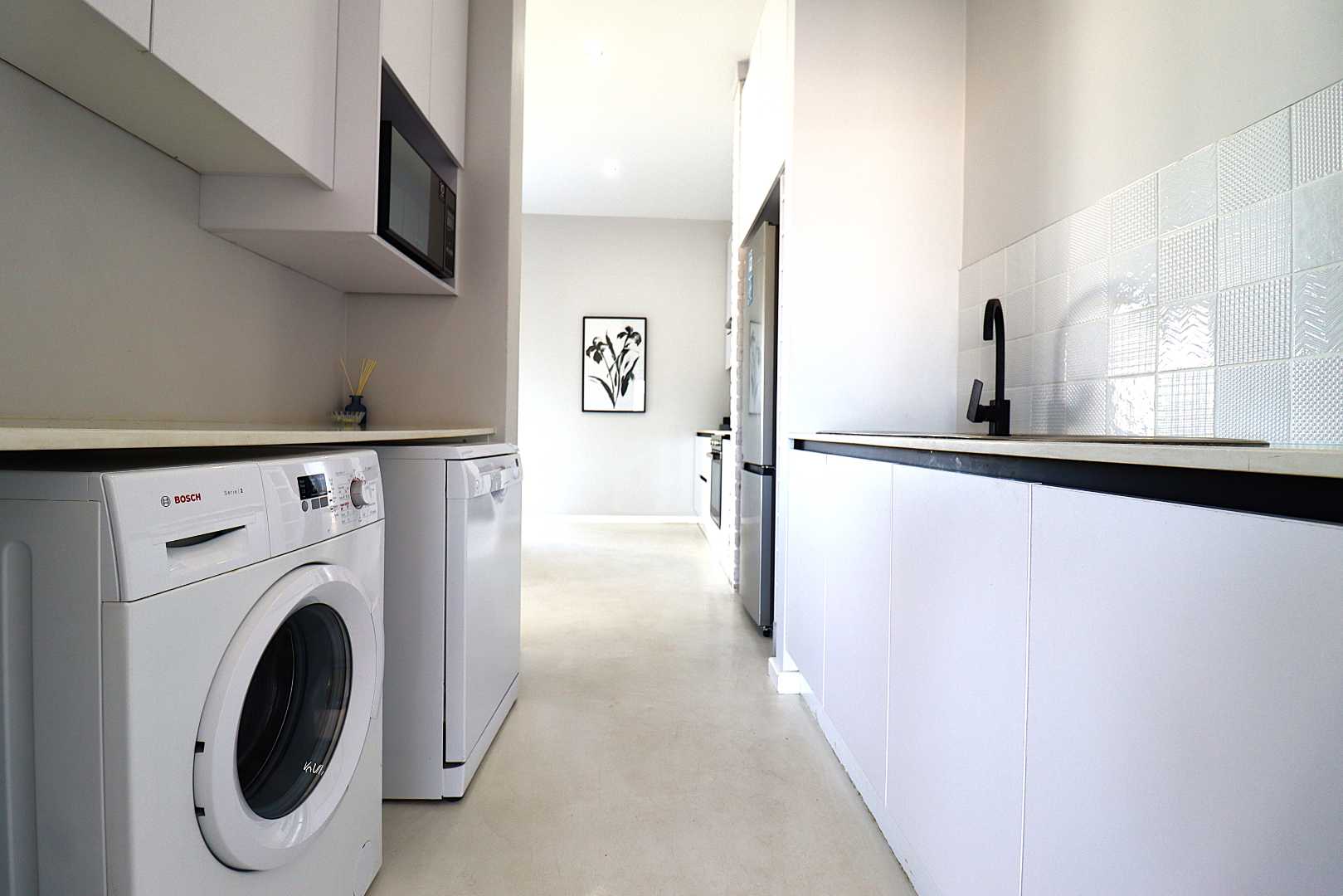 The kitchen is modern and functional, featuring a breakfast counter, prep bowl, built-in cupboards, stove and oven, and an extended wash-up area with washing machine and dishwasher connections. It flows into a spacious living lounge that extent with stacking glass doors onto a private terrace and garden.