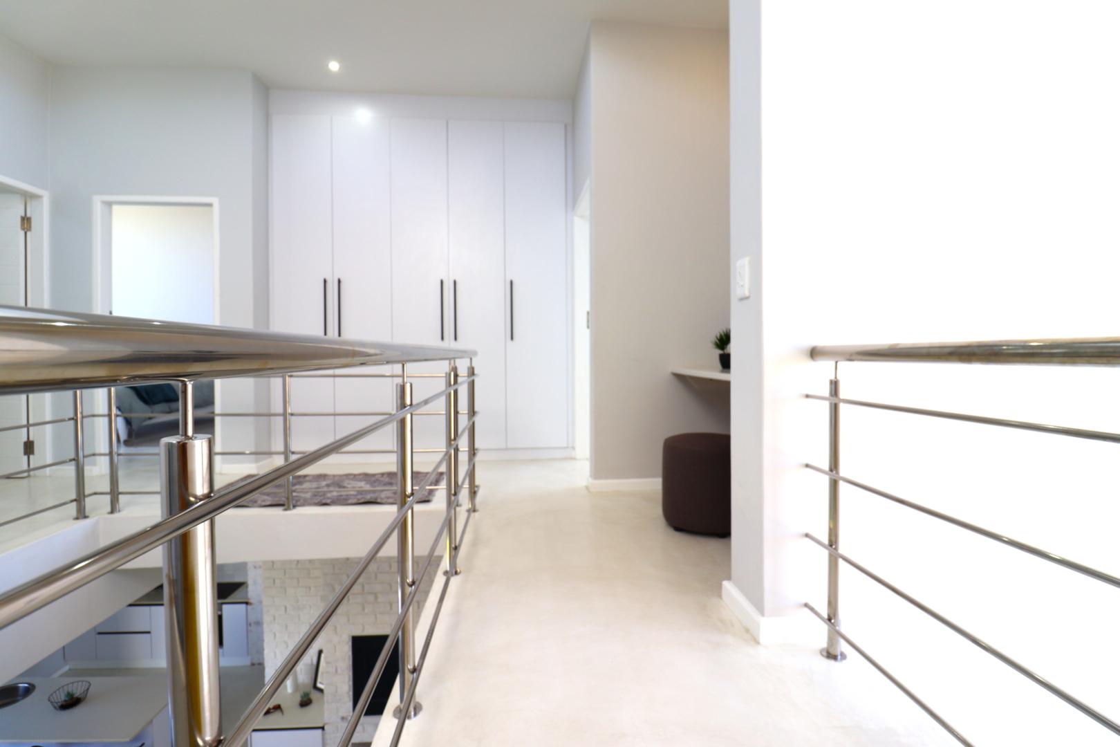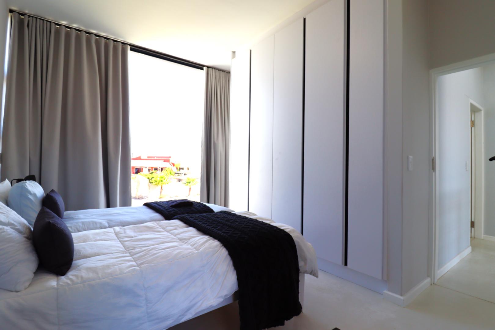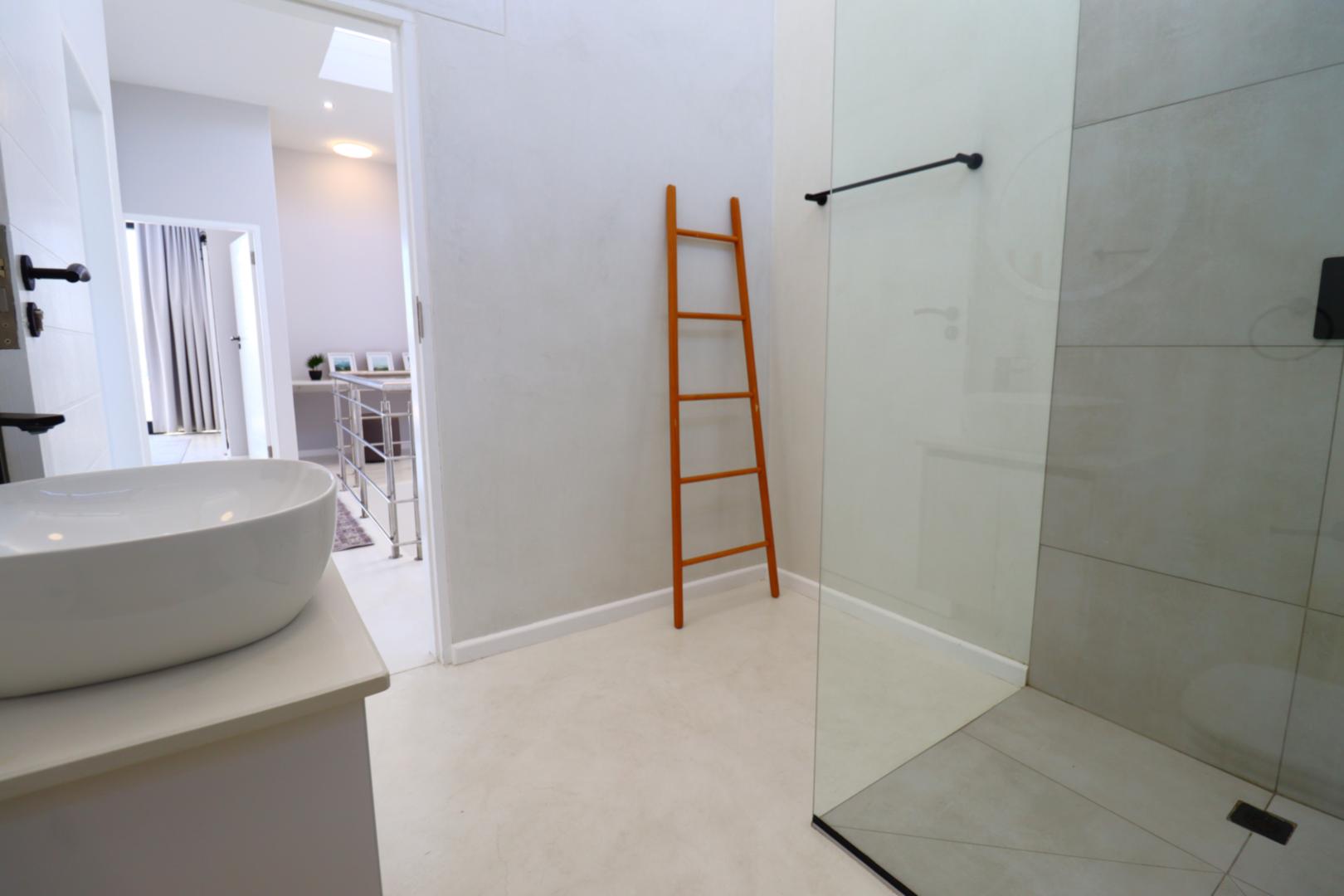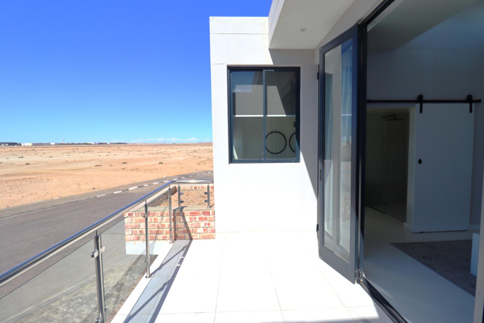 A double-volume staircase with large windows leads to the landing area with a study nook and access to three spacious bedrooms. The main suite has built-in cupboards, a large en-suite bathroom with bath, shower, double basins and toilet, and sliding doors onto a balcony overlooking the neighbourhood and distant Namib-Naukluft views. Two additional bedrooms, also with built-in cupboards, enjoy dune views and share a spacious bathroom with shower, basin and toilet.