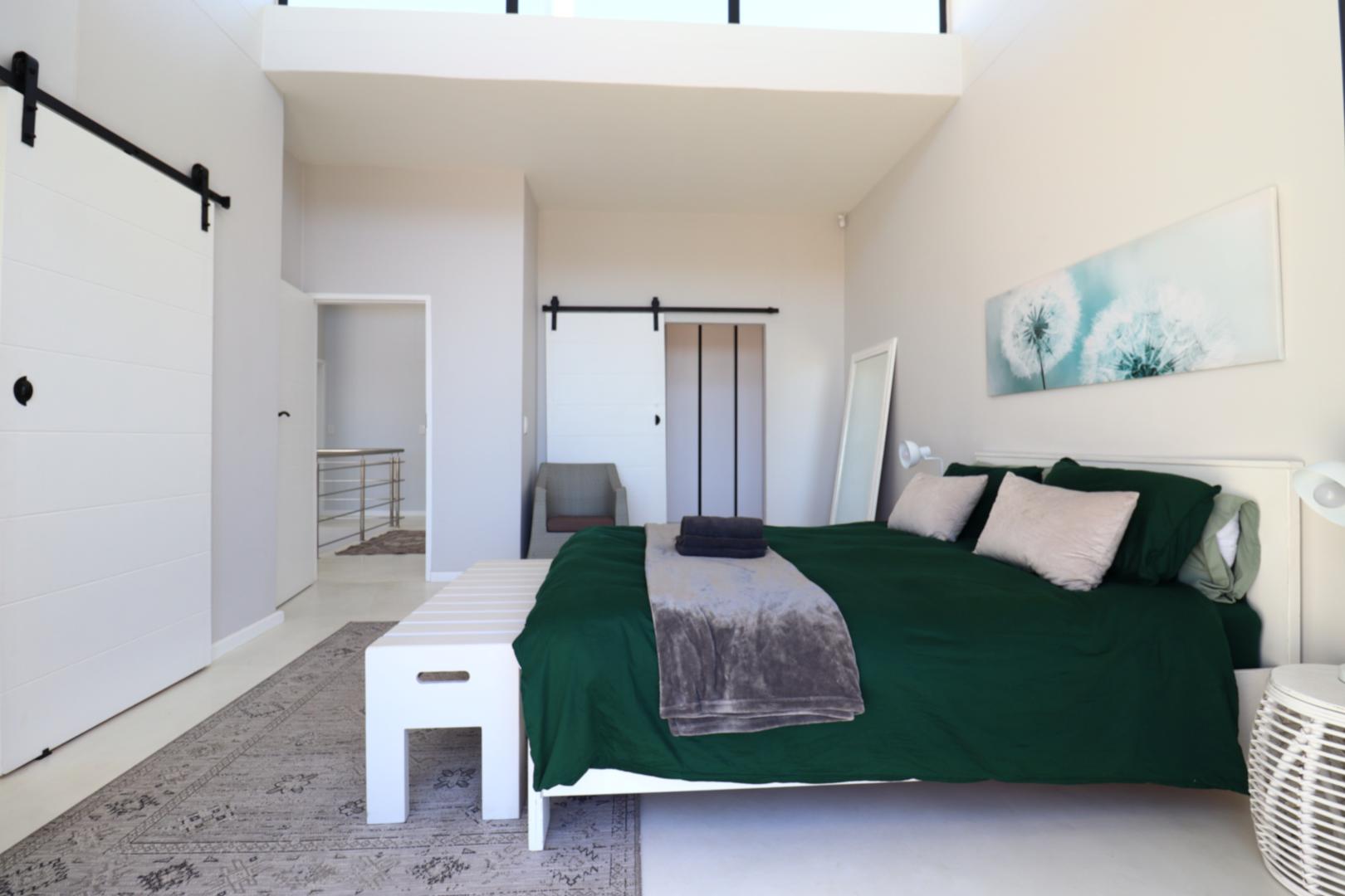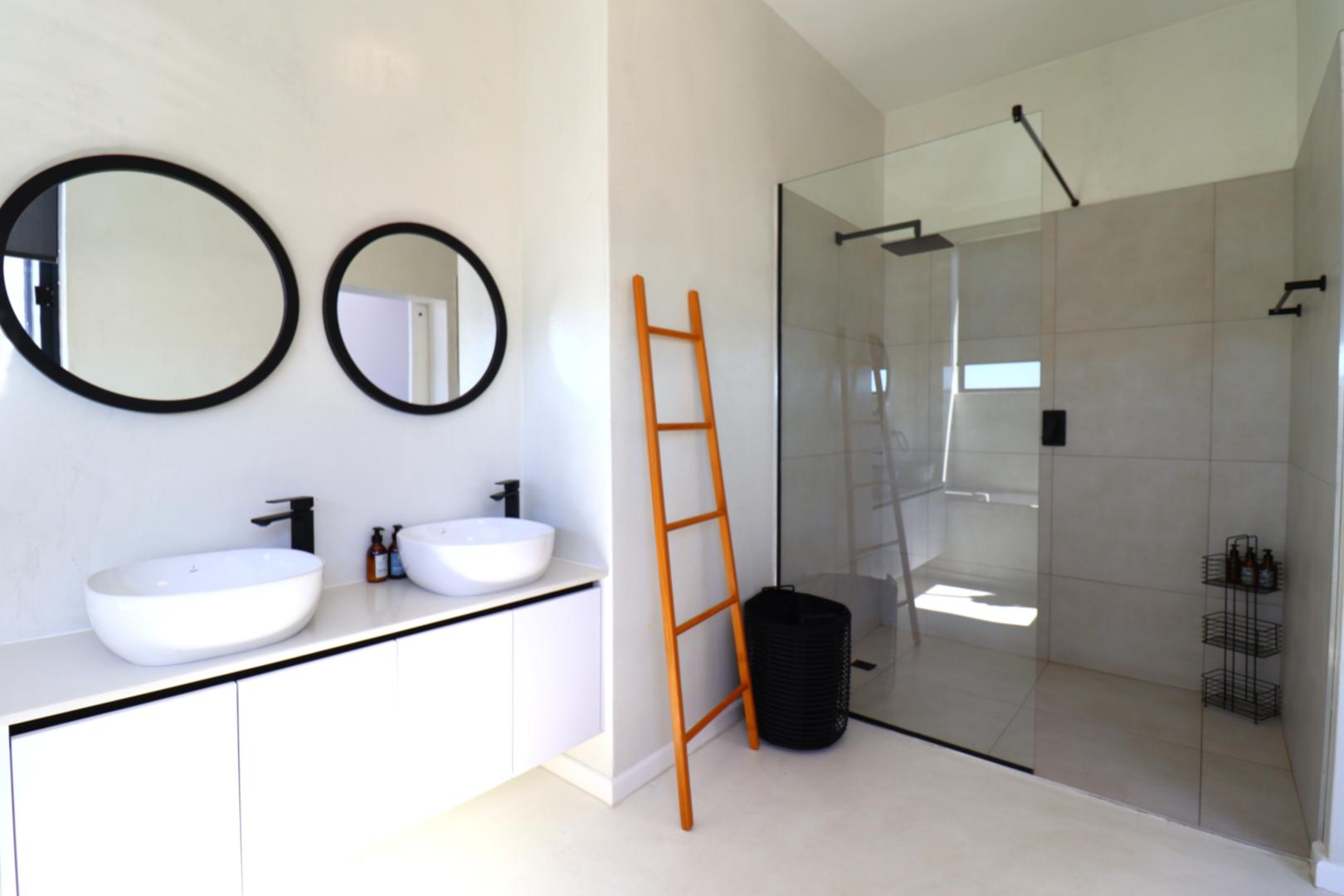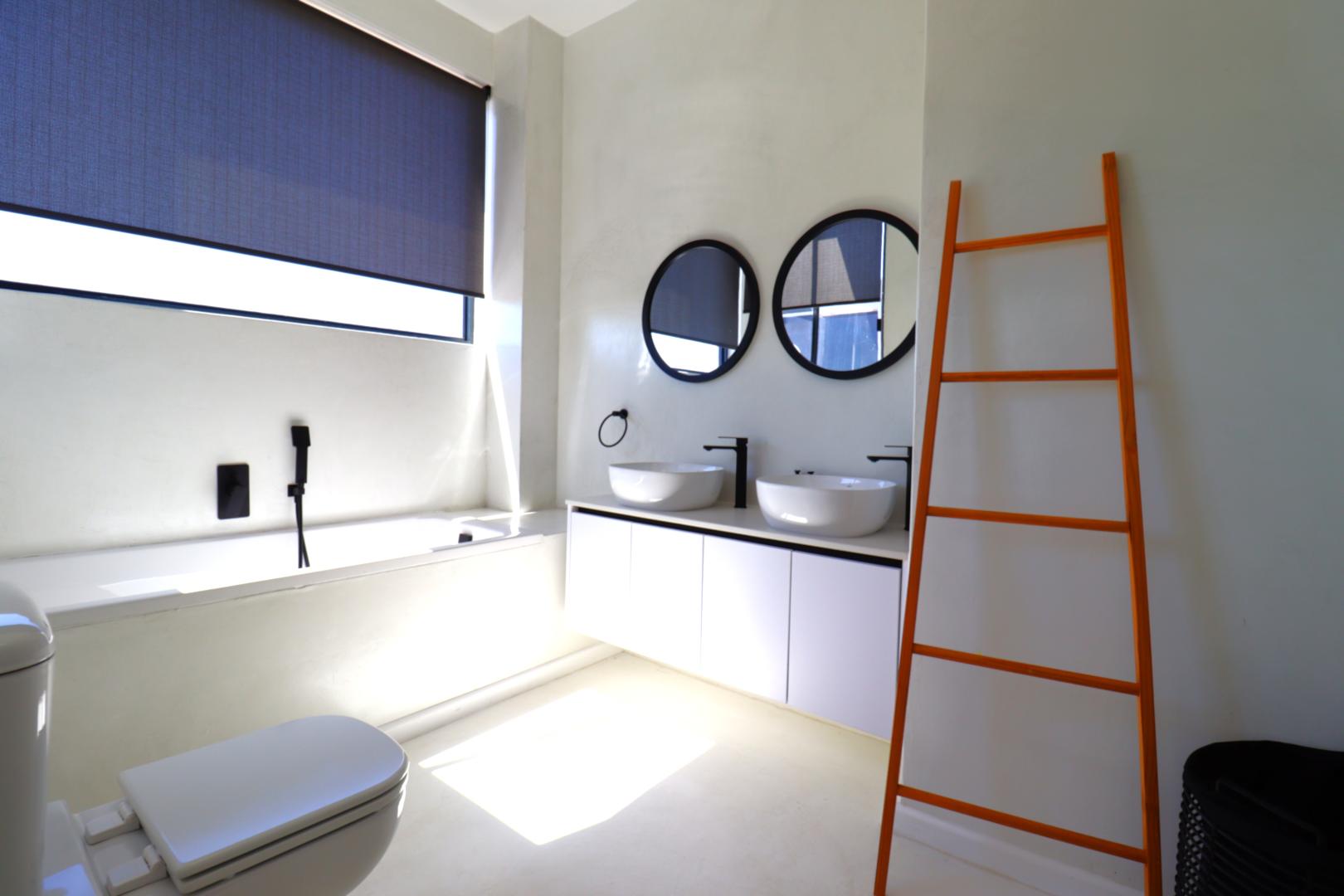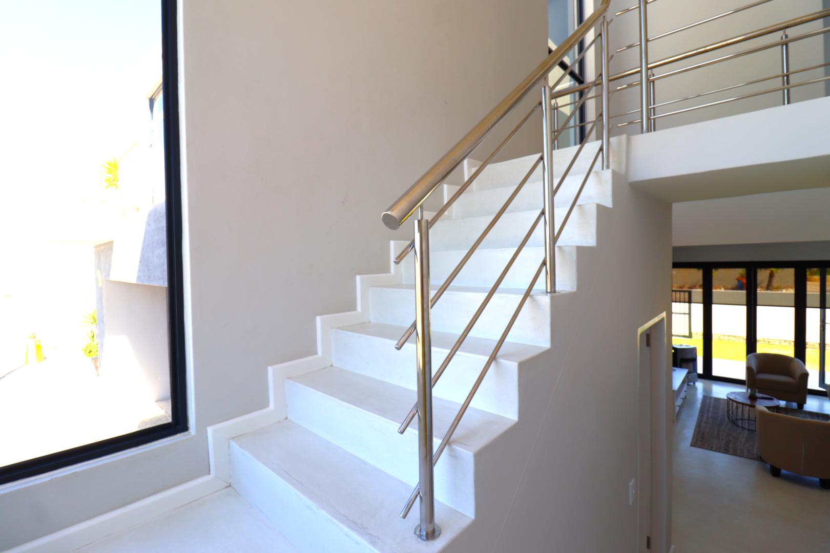 A double-volume staircase with large windows leads to the landing area with a study nook and access to three spacious bedrooms. The main suite has built-in cupboards, a large en-suite bathroom with bath, shower, double basins and toilet, and sliding doors onto a balcony overlooking the neighbourhood and distant Namib-Naukluft views. Two additional bedrooms, also with built-in cupboards, enjoy dune views and share a spacious bathroom with shower, basin and toilet.