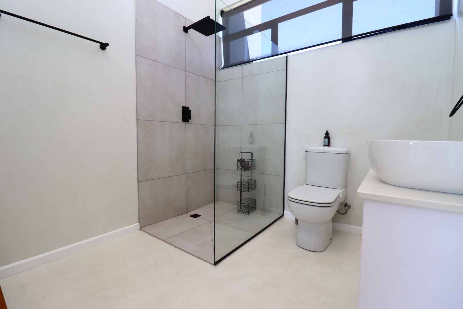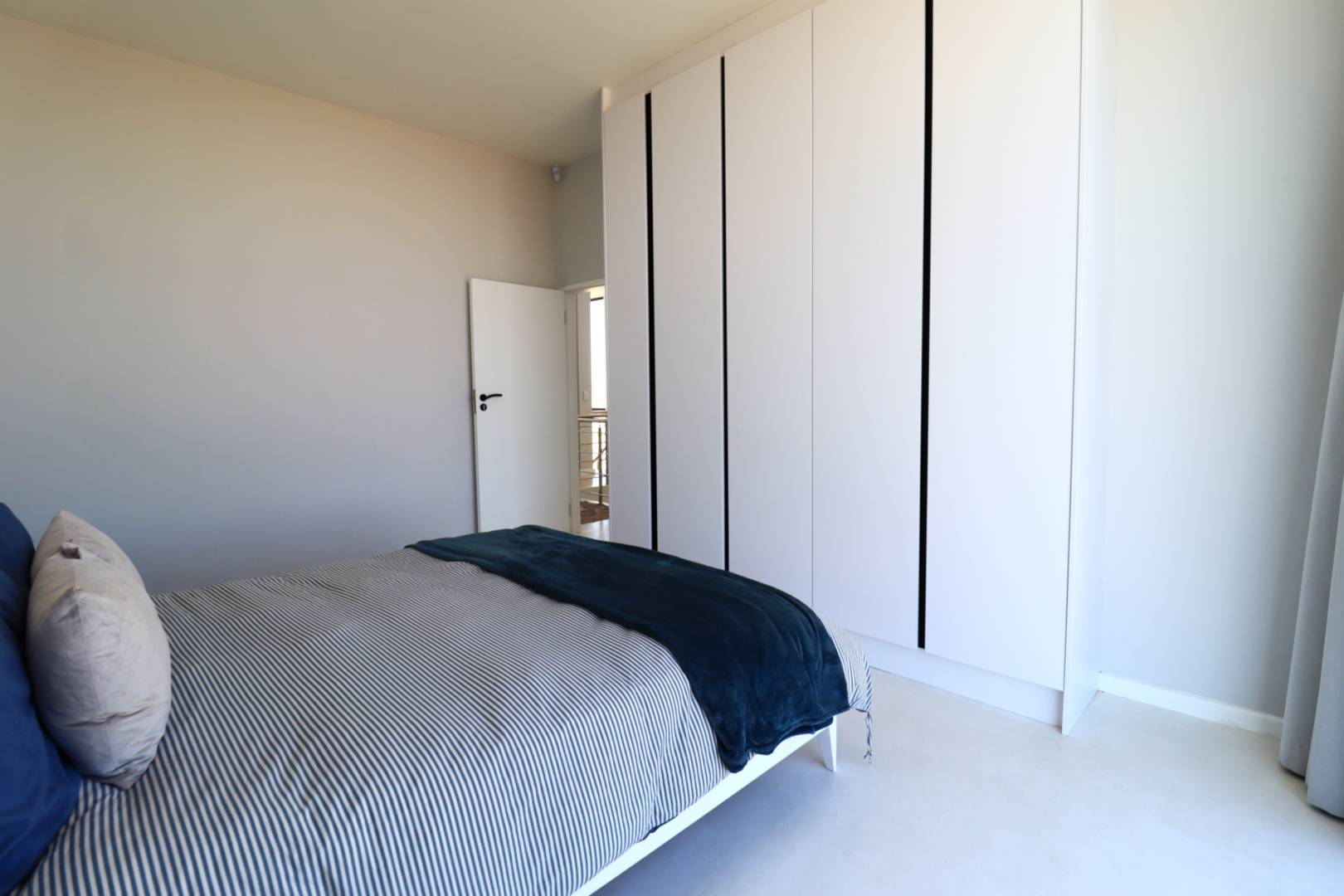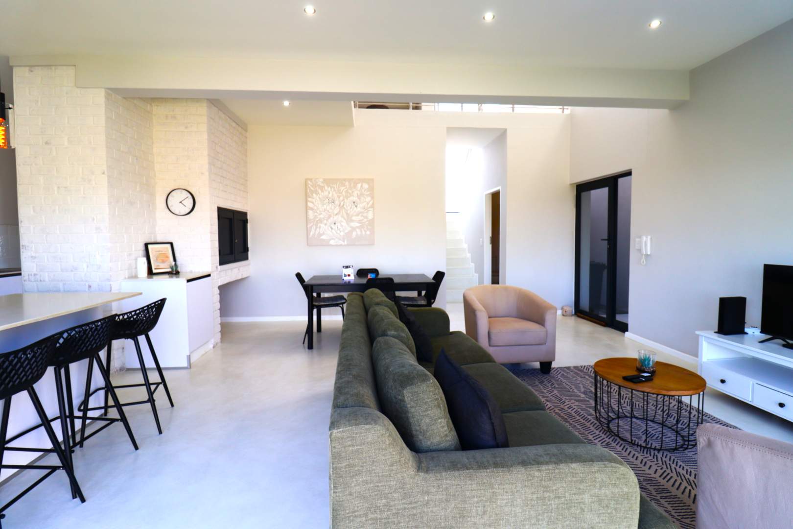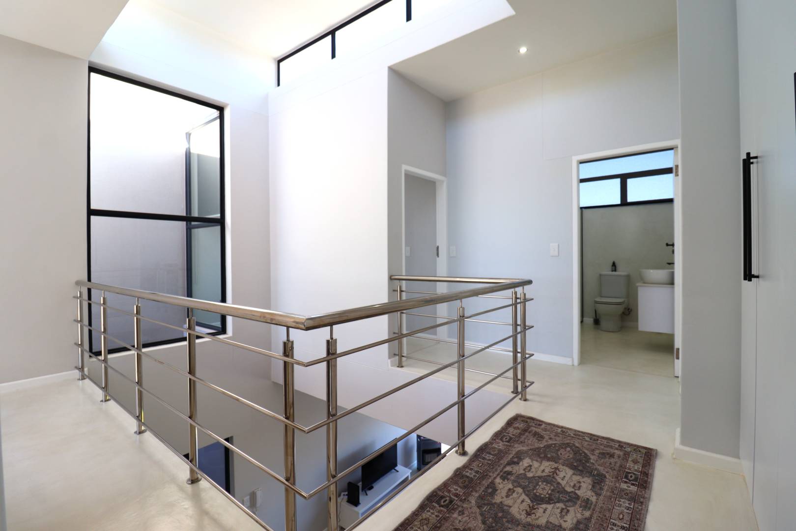 A double-volume staircase with large windows leads to the landing area with a study nook and access to three spacious bedrooms. The main suite has built-in cupboards, a large en-suite bathroom with bath, shower, double basins and toilet, and sliding doors onto a balcony overlooking the neighbourhood and distant Namib-Naukluft views. Two additional bedrooms, also with built-in cupboards, enjoy dune views and share a spacious bathroom with shower, basin and toilet.