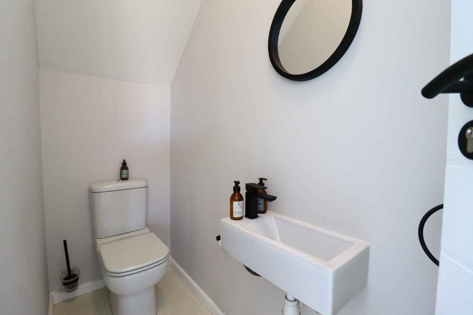 The wind-protected entrance opens into a bright guest lounge with a neatly placed guest toilet.