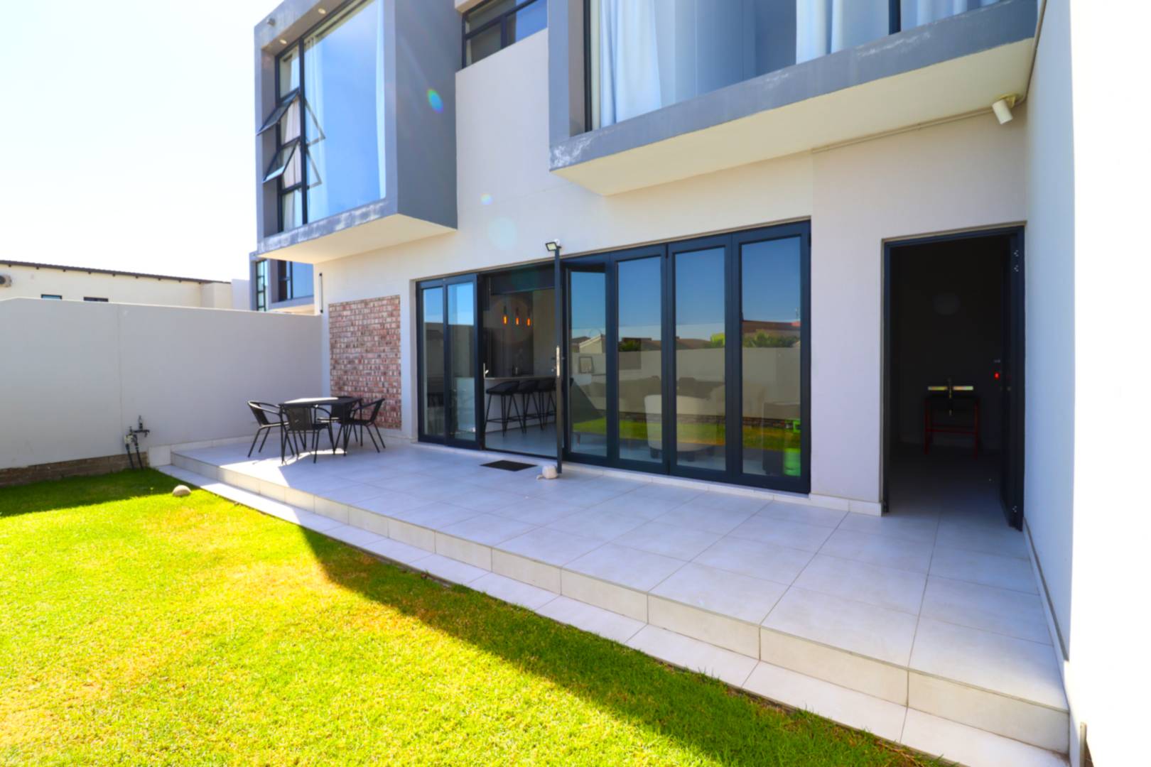 Paving surrounds the townhouse, keeping outdoor areas neat and low-maintenance. An outdoor storeroom adds extra convenience.