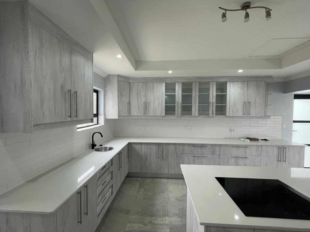 The modern kitchen features ample built-in cupboards, a stove, oven, and a separate scullery. It connects to an open-plan living and dining area with an indoor BBQ, creating a comfortable central space.
