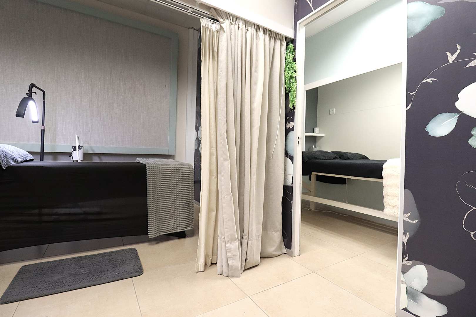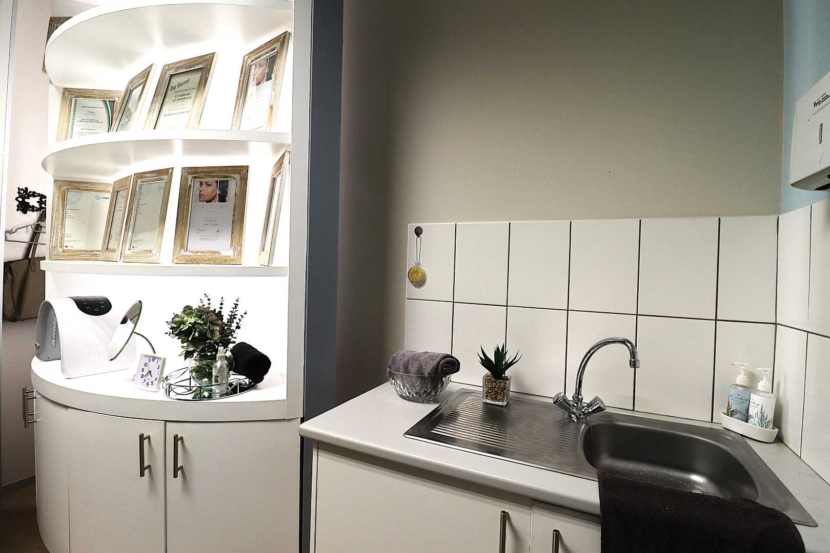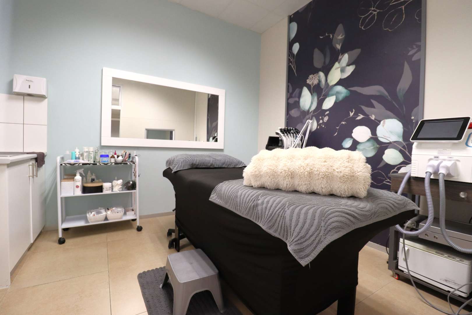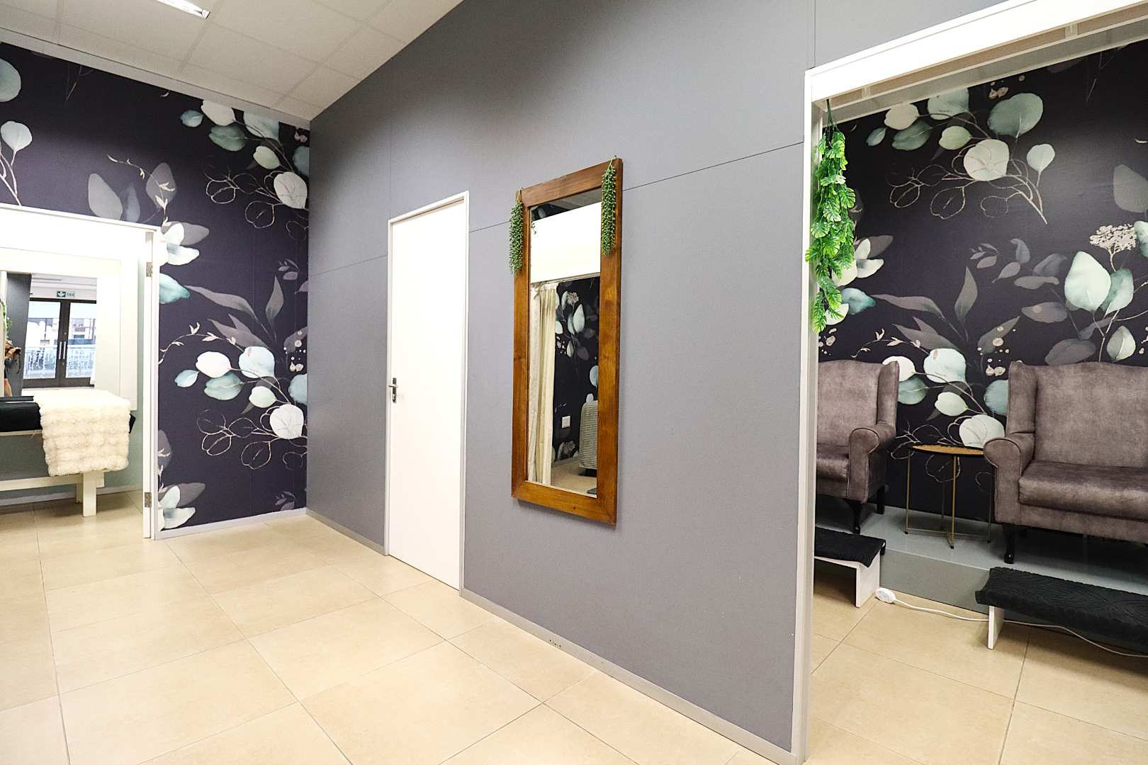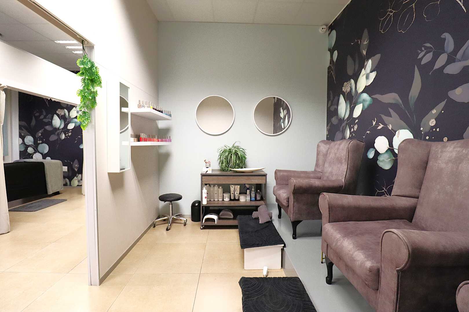 The salon features a large reception area with a modern reception desk and beautiful retail display cupboards for beauty products, a main treatment room with spa bed and basin with warm water, two manicure cubicles, one large pedicure cubicle, two spa treatment cubicles, and a large storage room with a staff room with a kitchenette and storage space.