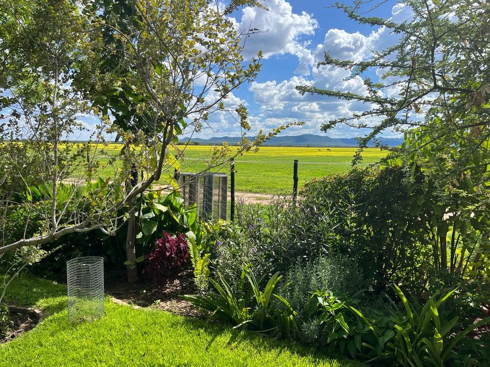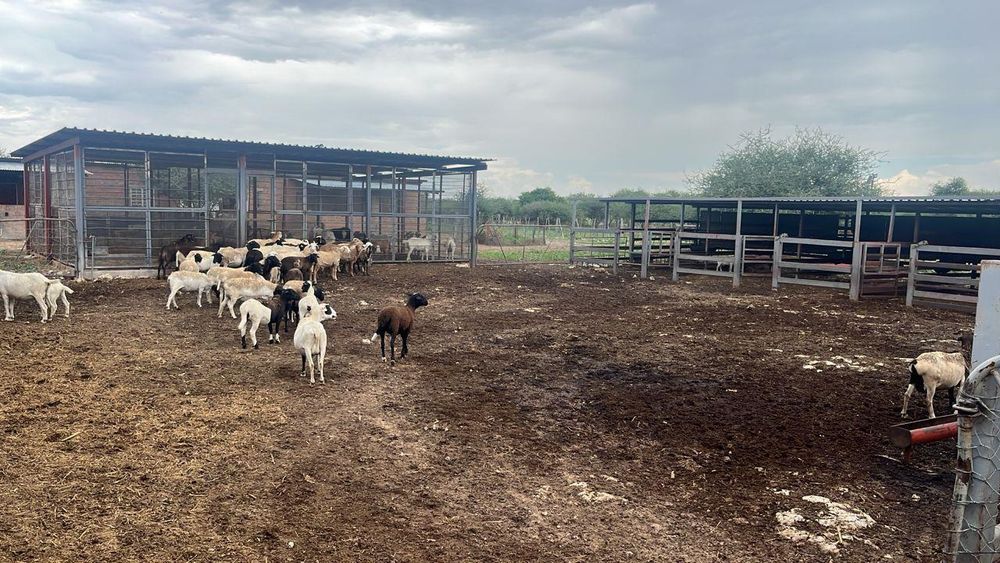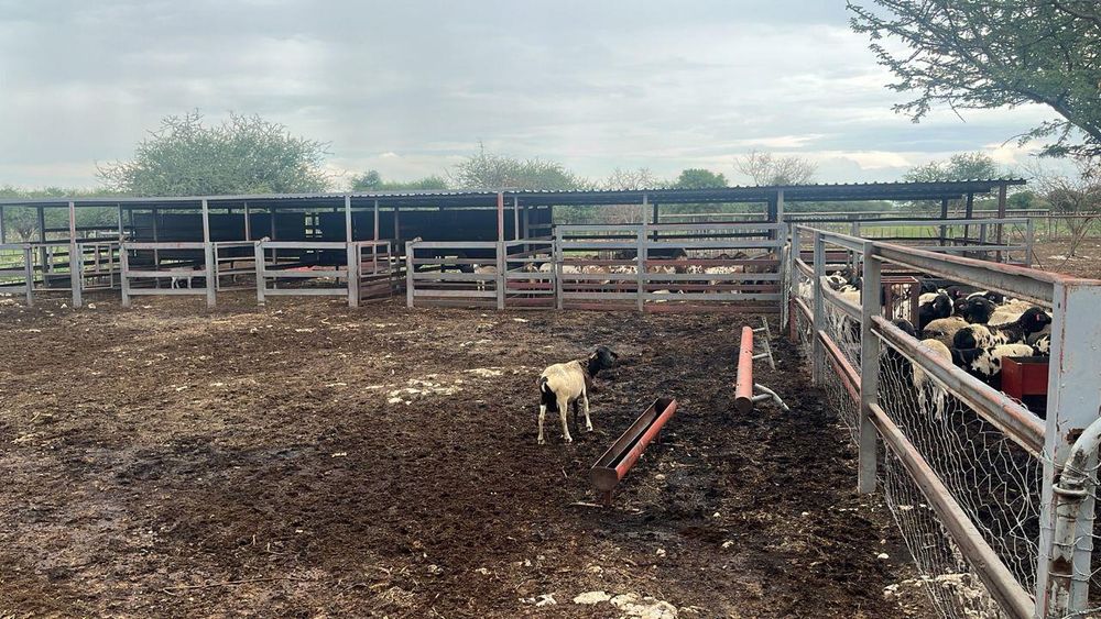 The farm includes permanent improvements such as a main house, double garage with a carport, a storage shed, a meat-processing room with a basement cooler, staff housing with ablution facilities, and a small cheese factory.
