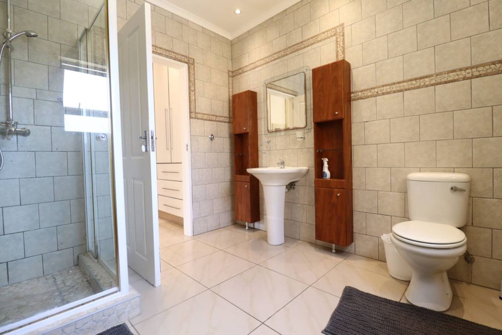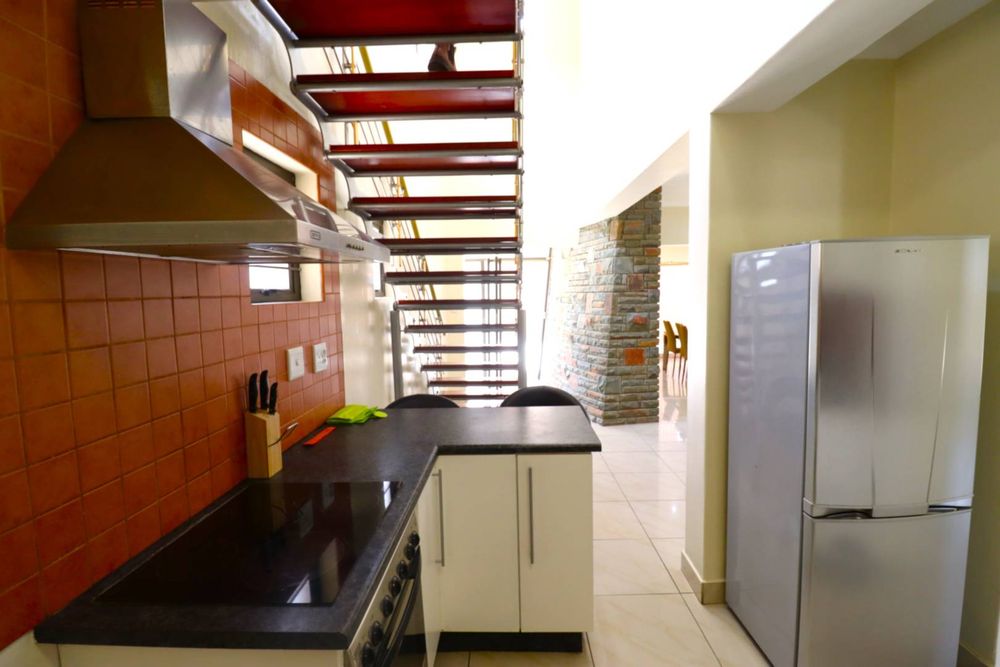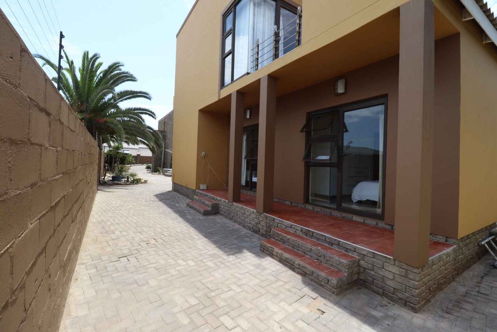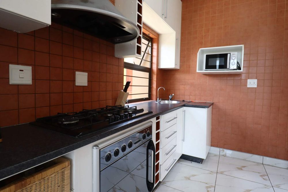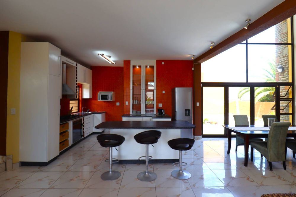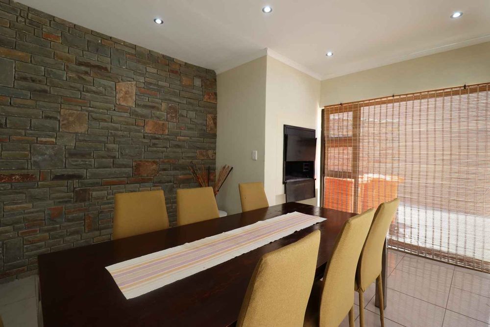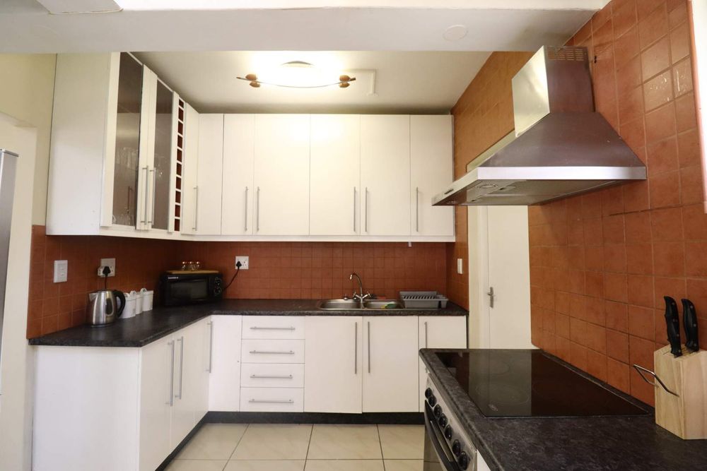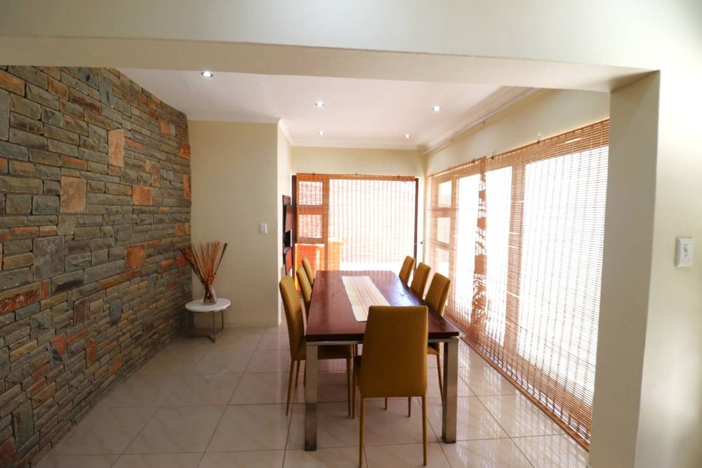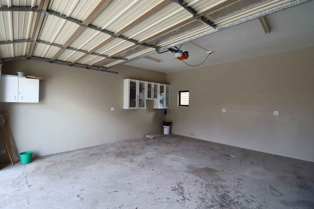 The main two-story house welcomes you into a bright lounge combined with the dining area, featuring a built-in BBQ and an open kitchen with a built-in stove, oven, and cupboards. The scullery and wash-up area connects directly to the double garage, and there is a small scullery courtyard for added convenience.