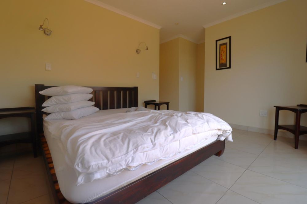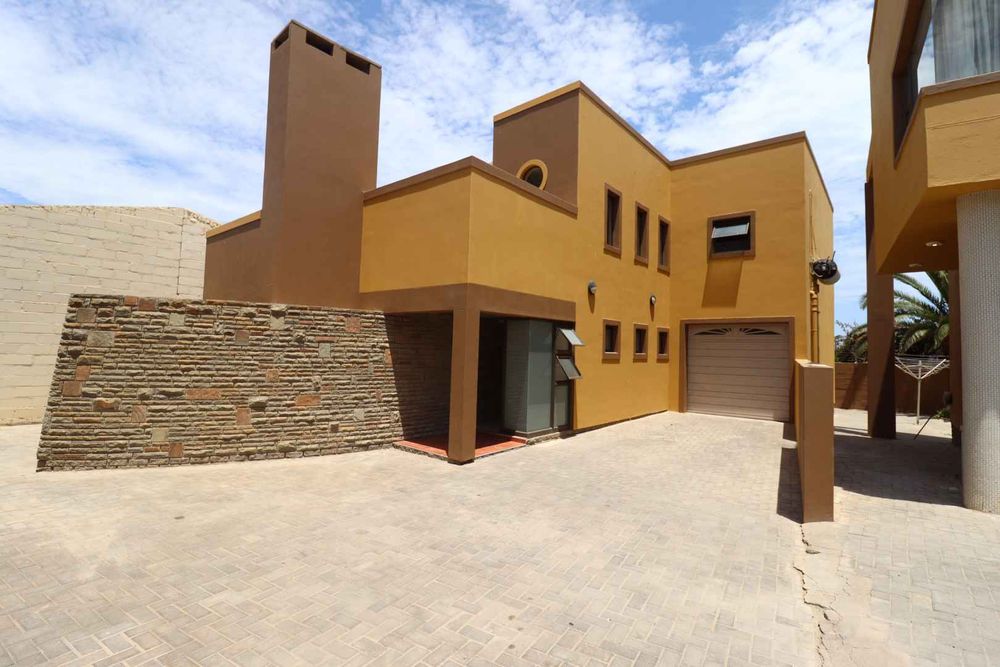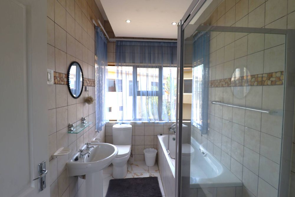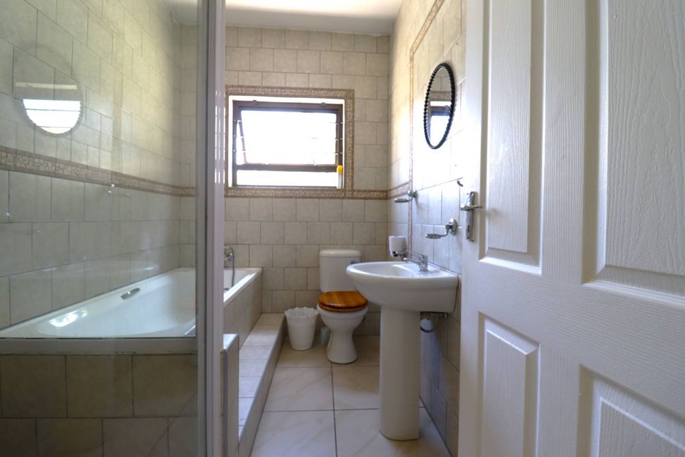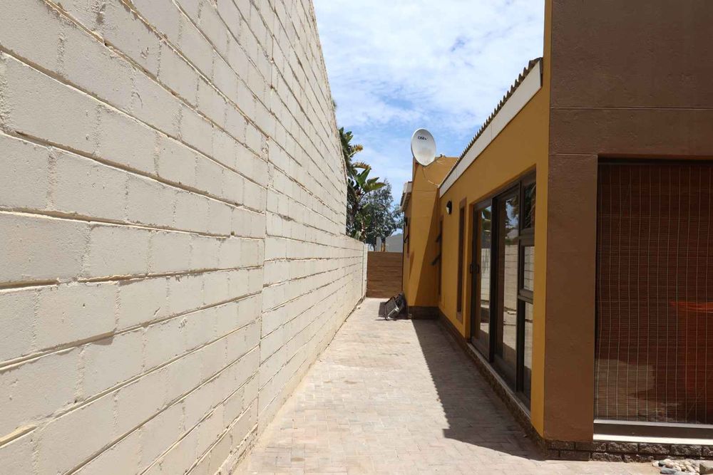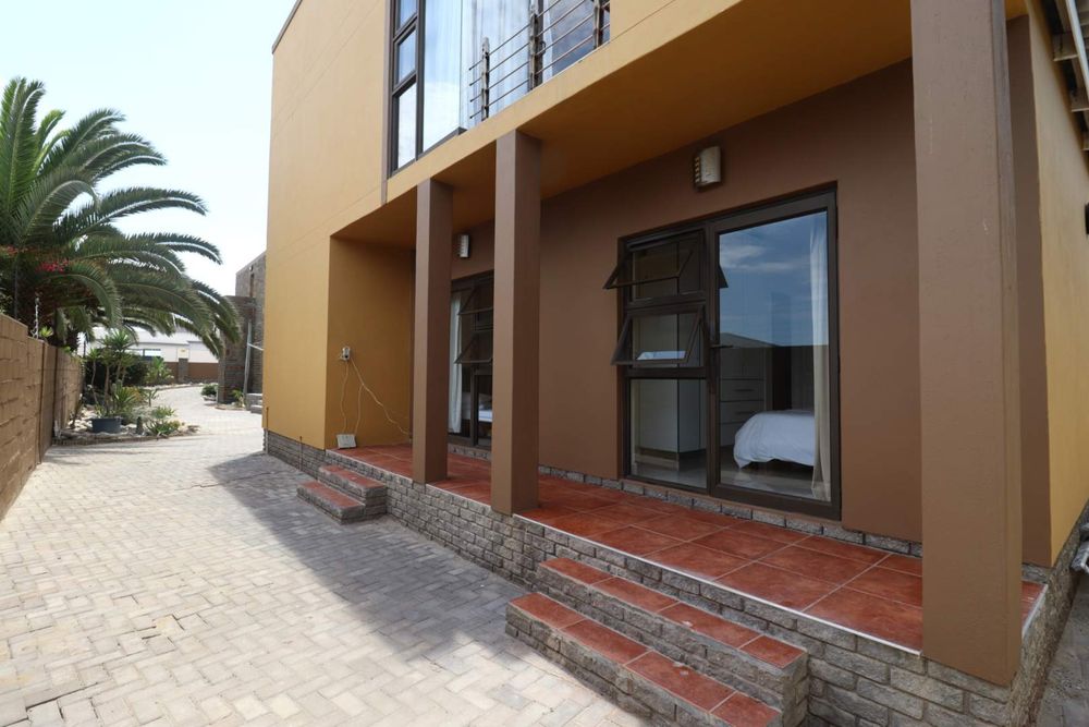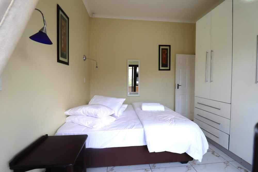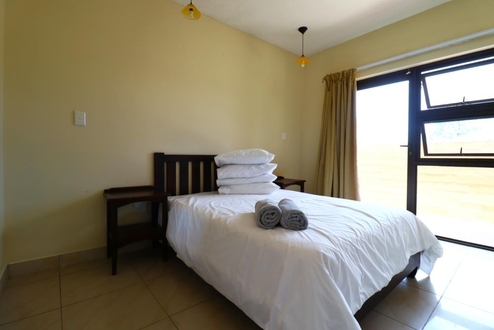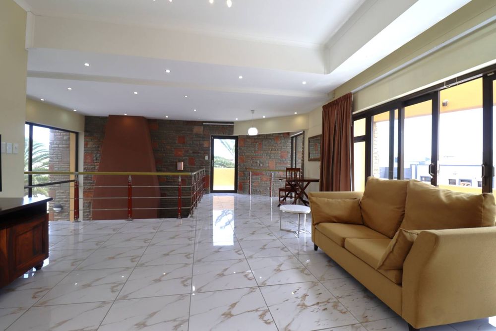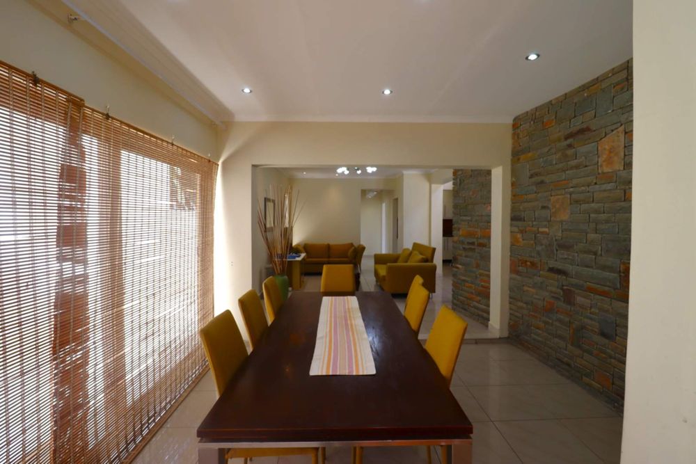 The main two-story house welcomes you into a bright lounge combined with the dining area, featuring a built-in BBQ and an open kitchen with a built-in stove, oven, and cupboards. The scullery and wash-up area connects directly to the double garage, and there is a small scullery courtyard for added convenience.