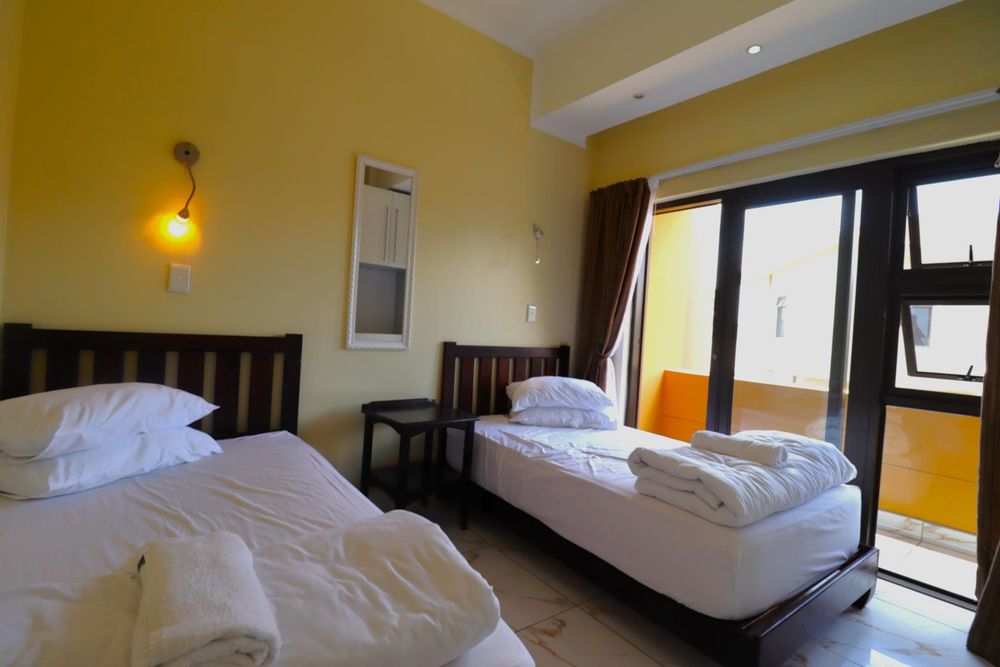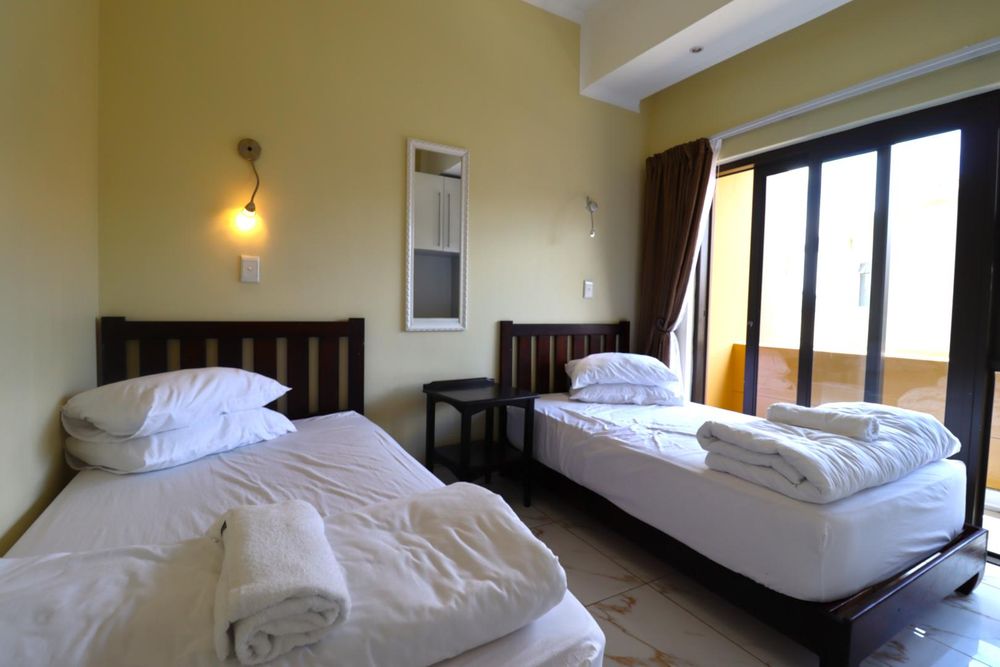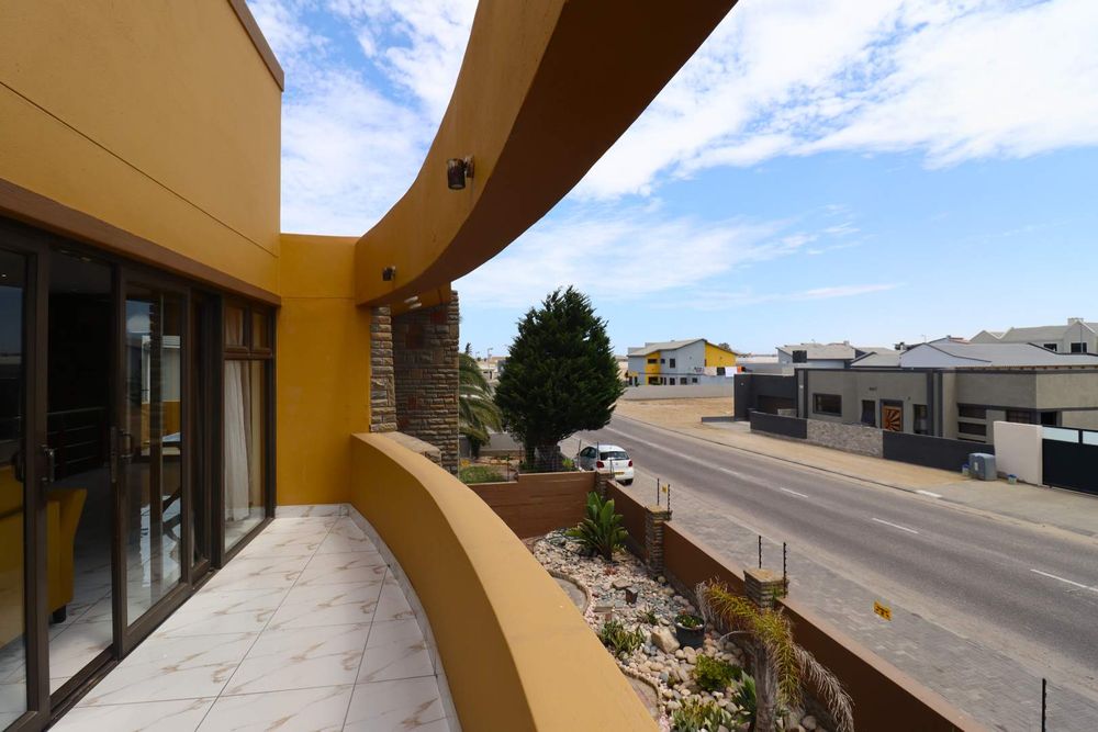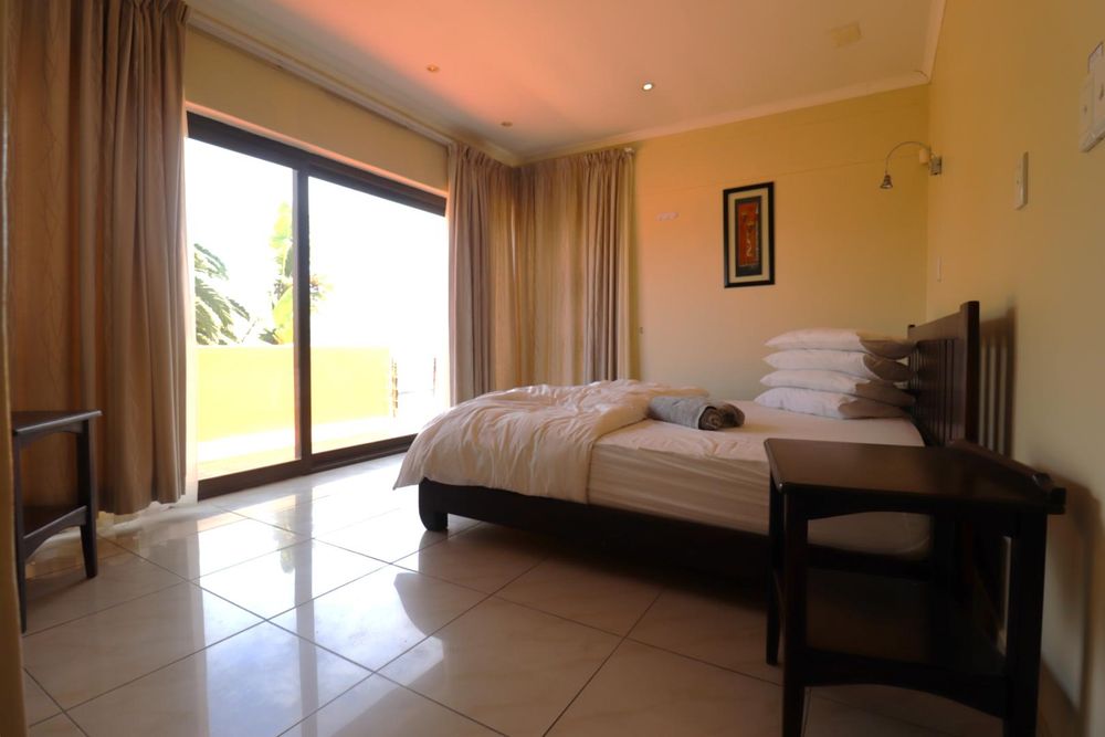Upstairs, stairs lead to a large private family lounge with expansive windows and a balcony. Three generously sized bedrooms provide privacy and comfort for the family. The spacious main bedroom includes a balcony, a full en-suite bathroom, and built-in cupboards. Both guest bedrooms, each with a private balcony and built-in cupboards, share a full bathroom.