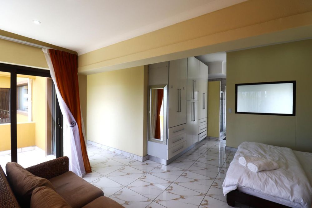 Upstairs, the flat offers a private retreat with one large bedroom opening onto a balcony, a full bathroom, walk-in cupboards, and a sauna, creating a luxurious private space for guests or family members.