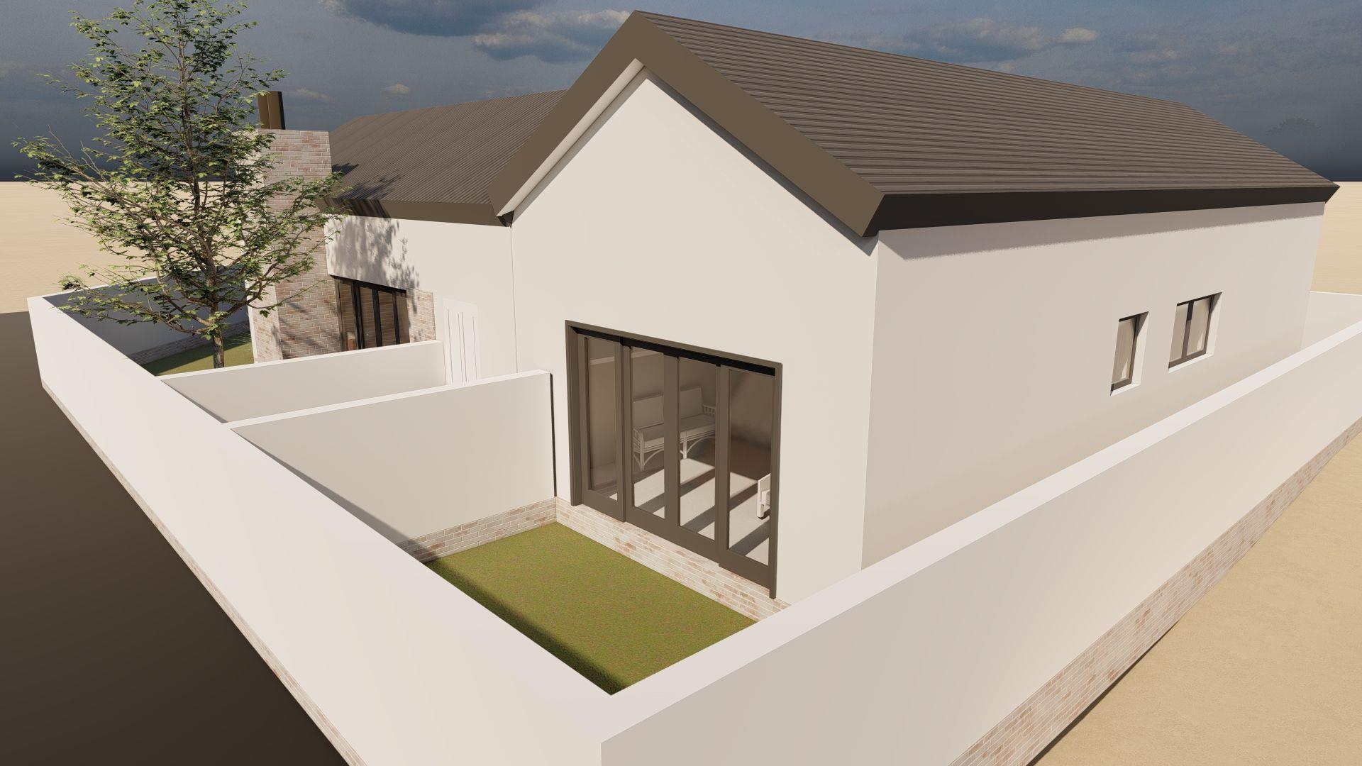 This freestanding cottage-style house features open-plan living with indoor BBQ, natural light from exposed roof trusses, and a kitchen with built-in cupboards, stove, oven, scullery, and pantry.