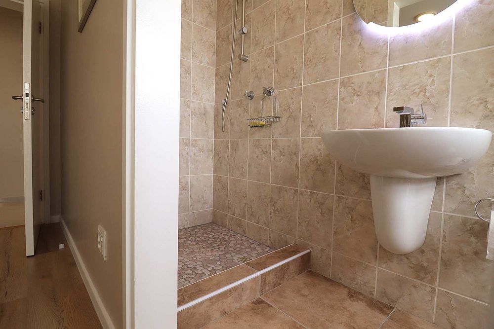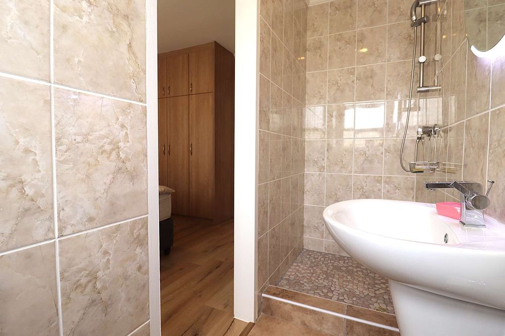The modern open-plan kitchen is fully fitted with German-style built-in cupboards and induction hob. Storage is excellent throughout the home, including additional large linen cupboards.