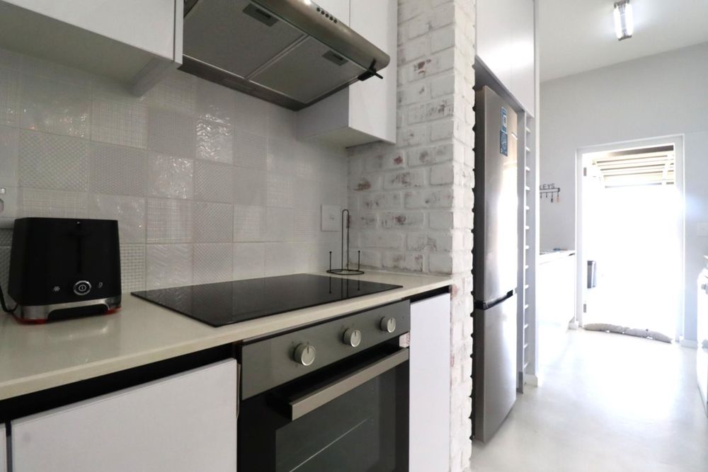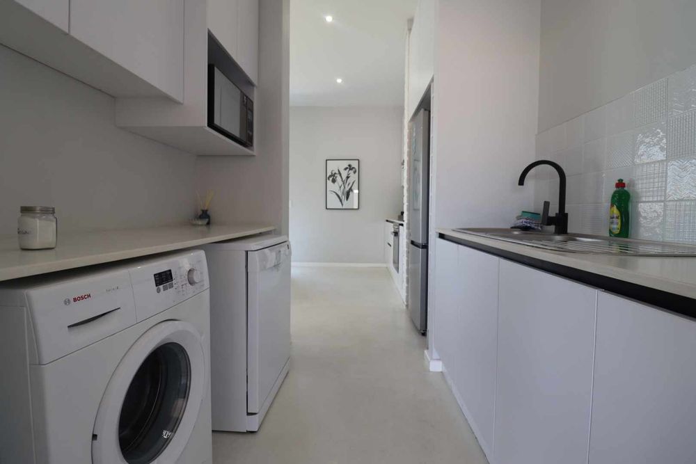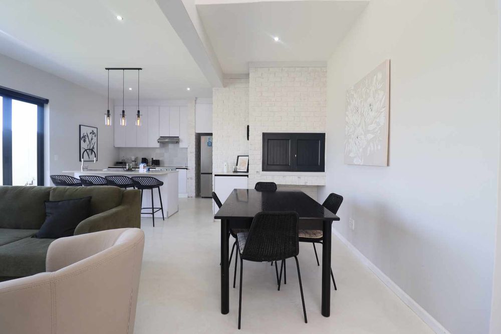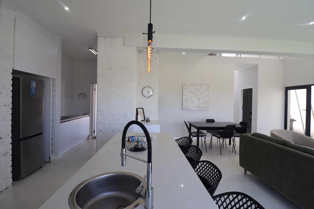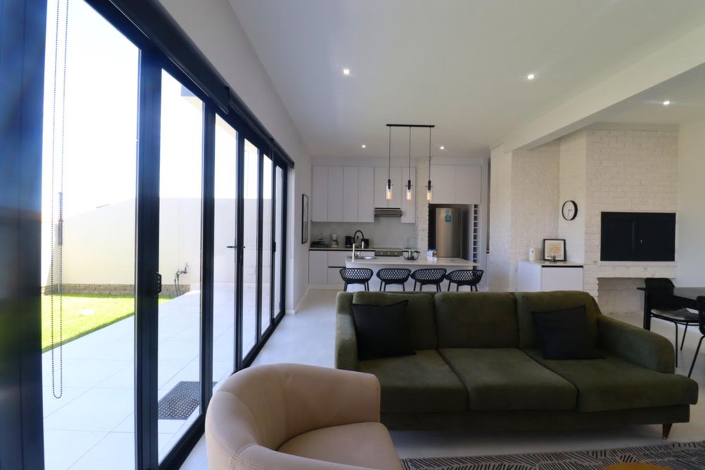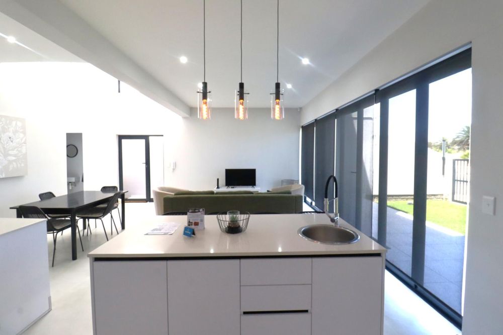 The kitchen is designed for convenience and modern living, featuring a breakfast counter, preparation basin, built-in cabinetry, stove and oven, and an extended wash-up area with connections for washing machine and dishwasher appliances. It flows into the spacious living lounge that extends through stacking glass doors onto a private terrace and low-maintenance garden, creating a dune view indoor-outdoor living experience.