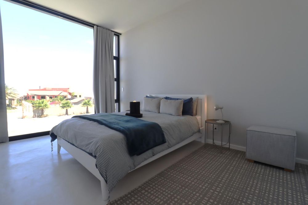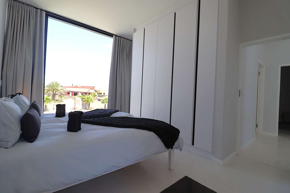 Designed to invite nature and sunlight, this upper level features large windows and a discreet staircase that enhance natural illumination. The guest bedrooms overlooks the unending Namib dunes through floor-to-roof glazing, and the main suite capture expansive views toward Namib-Naukluft National Park.