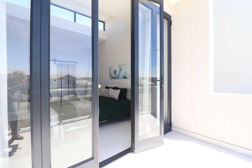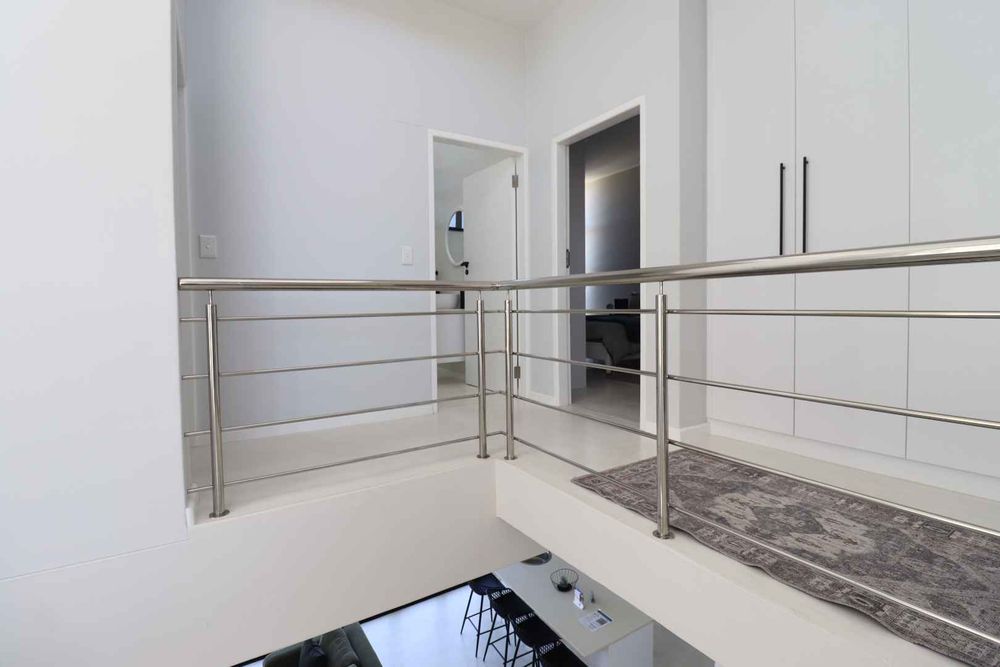 A study nook is positioned on the landing for practical home-office functionality, with access to three generously sized bedrooms. The main suite features built-in cabinetry and a spacious en-suite bathroom with bath, shower, double basins, and toilet, while sliding doors open onto a private balcony. From here, elevated views extend over the neighbourhood and toward distant landscapes, reinforcing a sense of space and connection to the coastal environment. The two additional bedrooms, both with built-in cupboards and panoramic dune views, share a well-appointed family bathroom with shower, basin, and toilet.