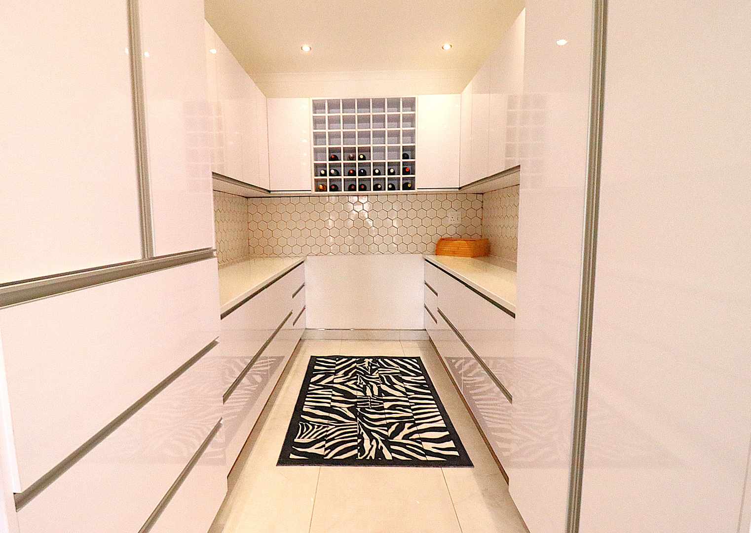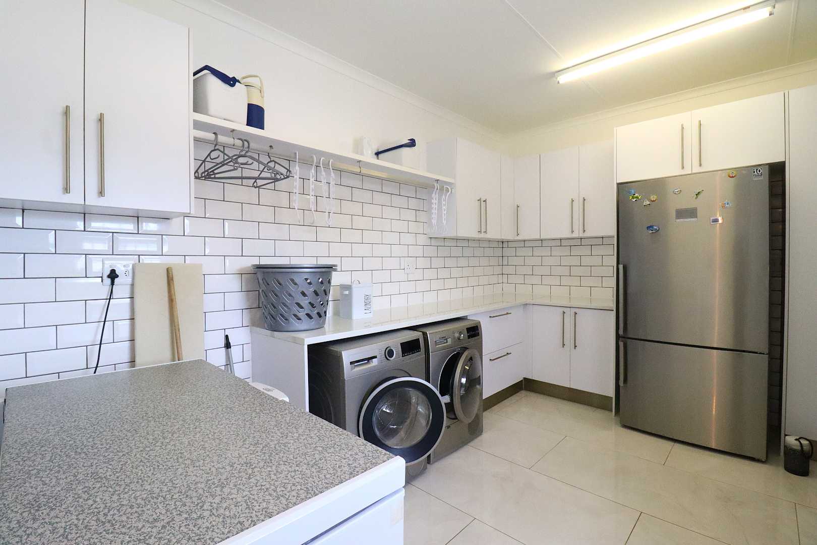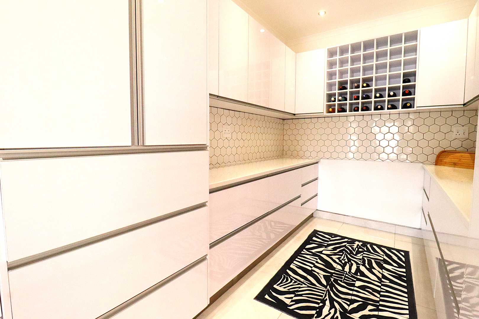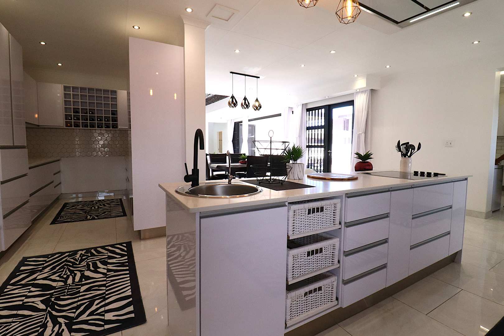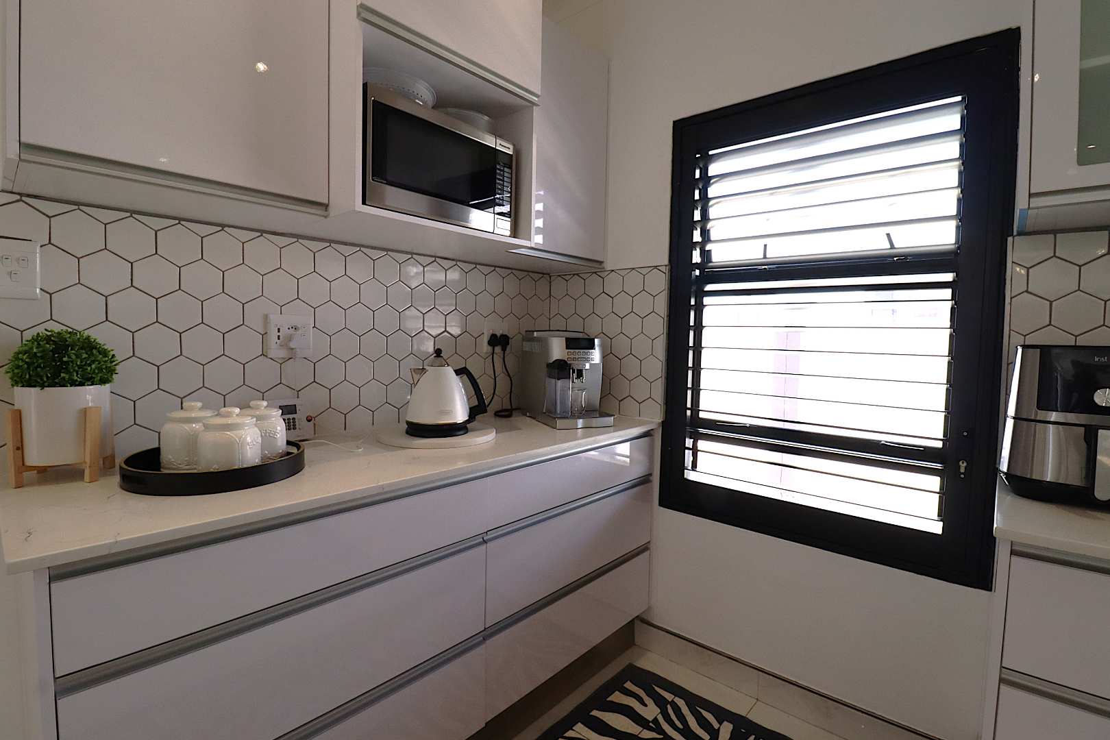 Stunning master designed and spacious kitchen that provides all the comfort you can dream with built-in cupboards, and a very well placed scullery and laundry with electrical fittings. Built-in stove with eye-level oven (90 cm) and extractor fan. The windows are fitted with stylish matt black security blinds. The round breakfast counter fits nicely to separate the dining and area from the kitchen.