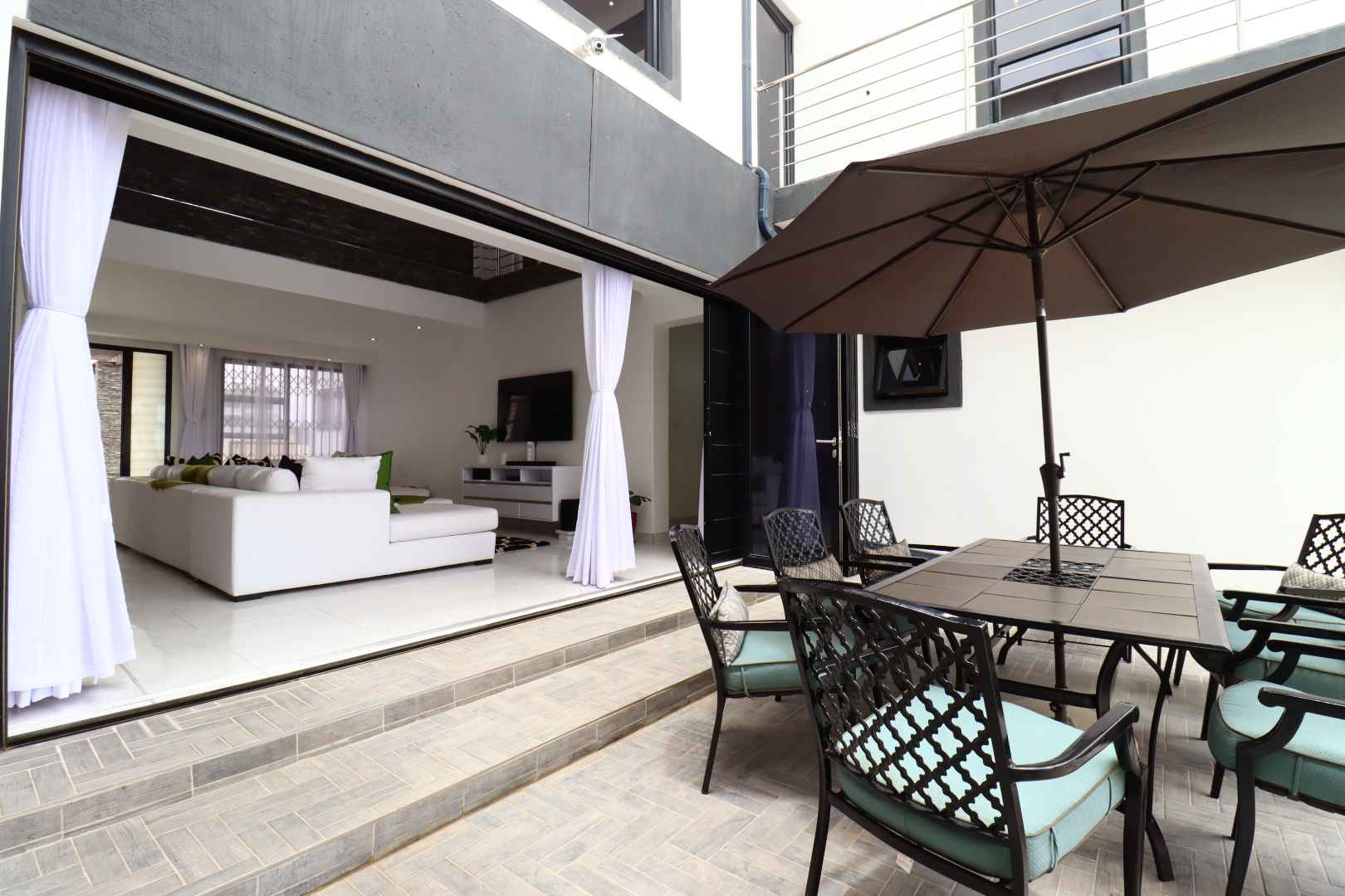 Patio entrance to the spacious lounge with specially designed lounge suite to fit the space. The double volume space is decorated with a chandelier. Stacking doors opens up to a private outside terrace designed for gathering with family or entertaining friends with a outdoor BBQ, wooden Pizza Oven, Bonfire Boma, and outdoor shower to off the sand after a swim in the ocean or time on the beach. Preparation in place to fit a Jacuzzi with all fittings in place.