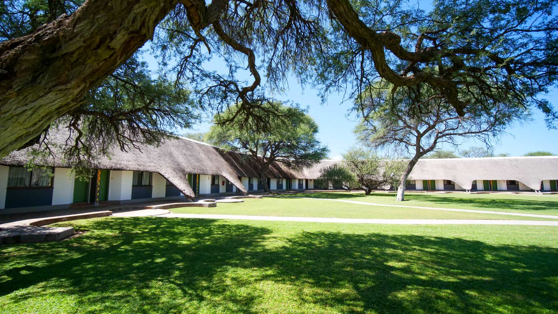 Relaxation spaces, including a beer garden and sparkling pool beneath Camelthorn trees where guests can enjoy nature and birdlife.