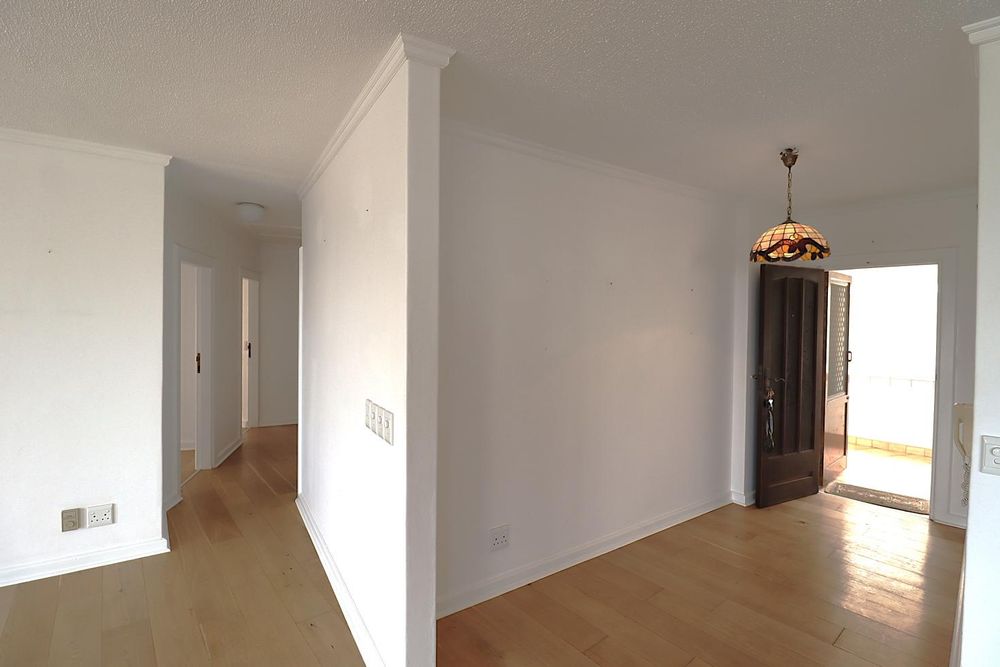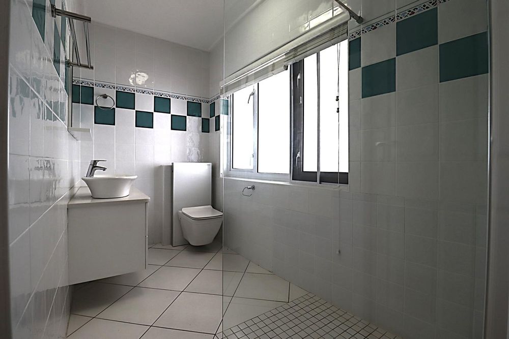 The main bedroom opens onto a private balcony with sweeping views of the sea and town. It offers a full ensuite bathroom and a walk-in wardrobe. Two additional guest bedrooms, both with built-in cupboards, share a bathroom with shower, basin and toilet. A separate guest WC near the lounge area adds extra convenience for guests.