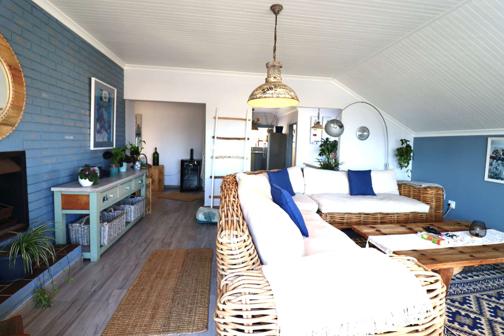 The main bedroom features an en-suite bathroom and overlooks the ocean, while two additional bedrooms share a family bathroom. The open-plan lounge with a cozy fireplace and kitchen flows together. The kitchen offers a small scullery and breakfast nook. The lounge opens onto a sea-view balcony with a built-in BBQ.