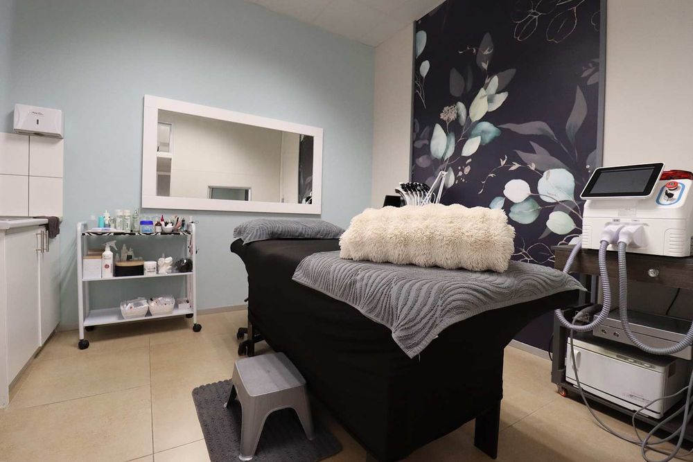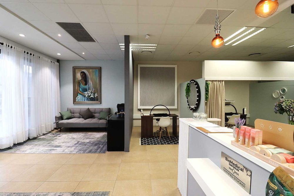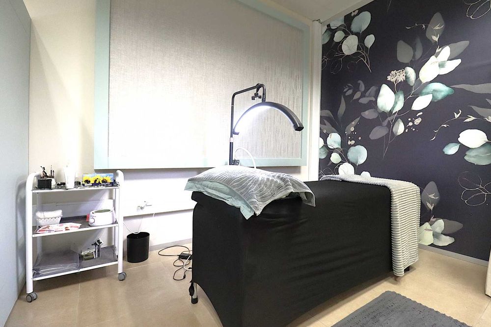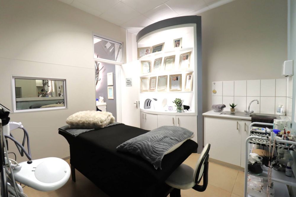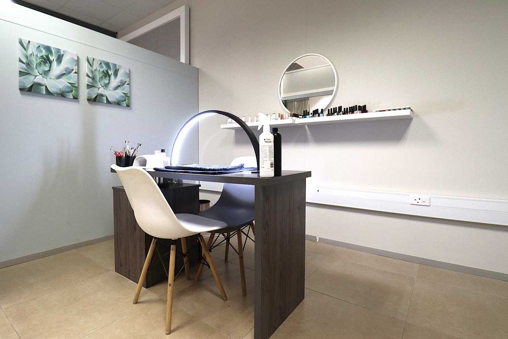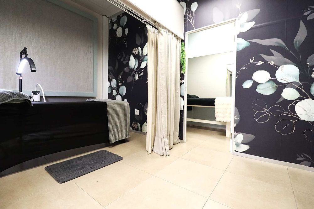 The salon features a large reception area with a modern reception desk and beautiful retail display cupboards for beauty products, a main treatment room with spa bed and basin with warm water, two manicure cubicles, one large pedicure cubicle, two spa treatment cubicles, and a large storage room with a staff room with a kitchenette and storage space.